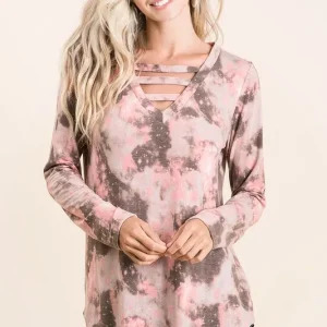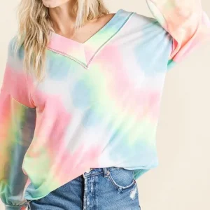 Tie Dye French Terry V-Neck Top with Puff Sleeves – Pink Multi