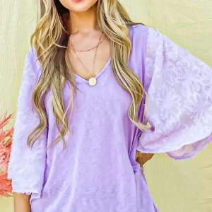 Feather Detailed 3/4 Sleeve Slub Top – Lilac