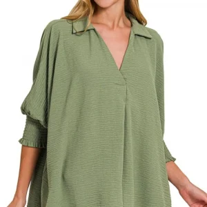 Airflow Collar Tee with Smocked Sleeve Band Top – Lt Olive