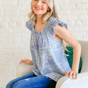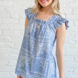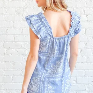 Boho Print Rayon Linen Ruffle Baby Doll Tank Top – Blue
