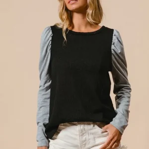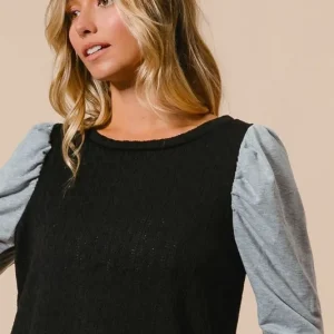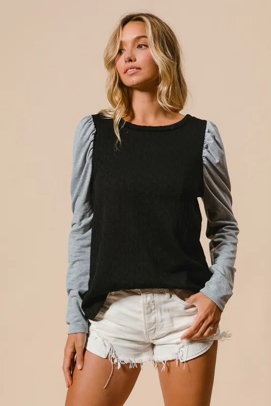 Cable Sweater Knit Top with Contrast Puff Sleeve – Black