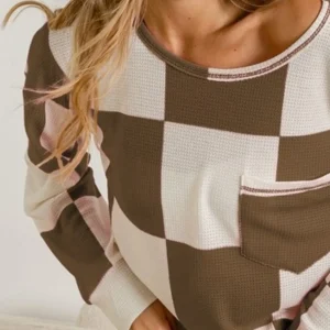 Checker Printed Hacci Top With Front Pocket – Taupe