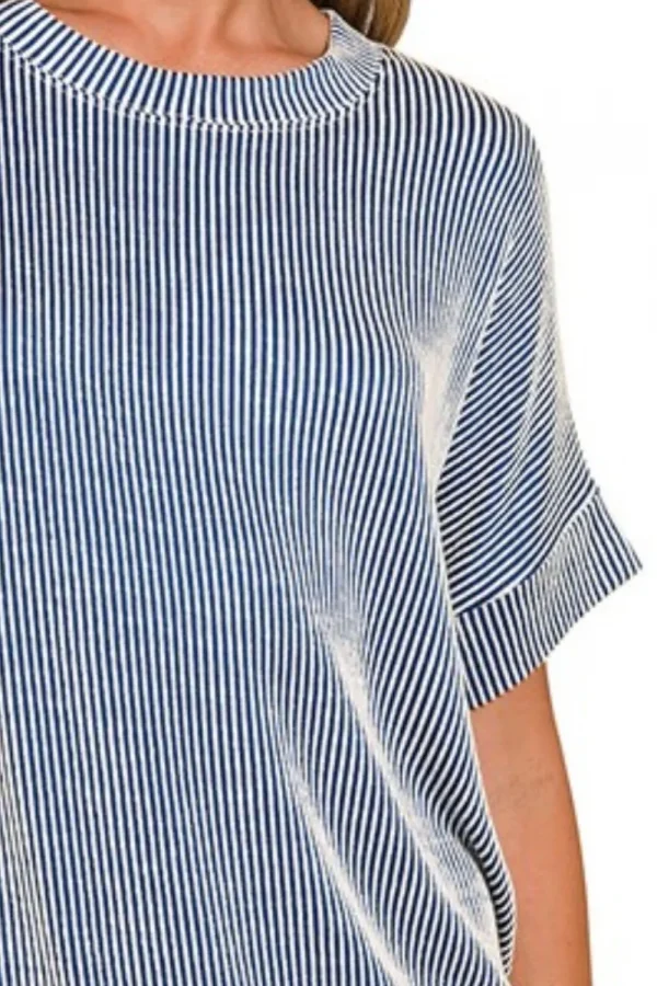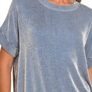 A Corded Rib Short Sleeve T-Shirt is a versatile and stylish top that features a textured corded ribbed fabric and short sleeves. The corded rib detailing adds visual interest and dimension to the t-shirt, creating a unique and trendy look. The short sleeves provide a casual and comfortable fit, making it suitable for everyday wear. This t-shirt can be dressed up with a skirt or trousers for a more polished outfit or paired with jeans for a relaxed and laid-back vibe. The Corded Rib Short Sleeve T-Shirt is a chic and versatile wardrobe staple that can be easily dressed up or down for various occasions.