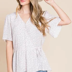 Ditsy Print V-Neck Short Sleeve Wrap Blouse – Ivory/Lavender