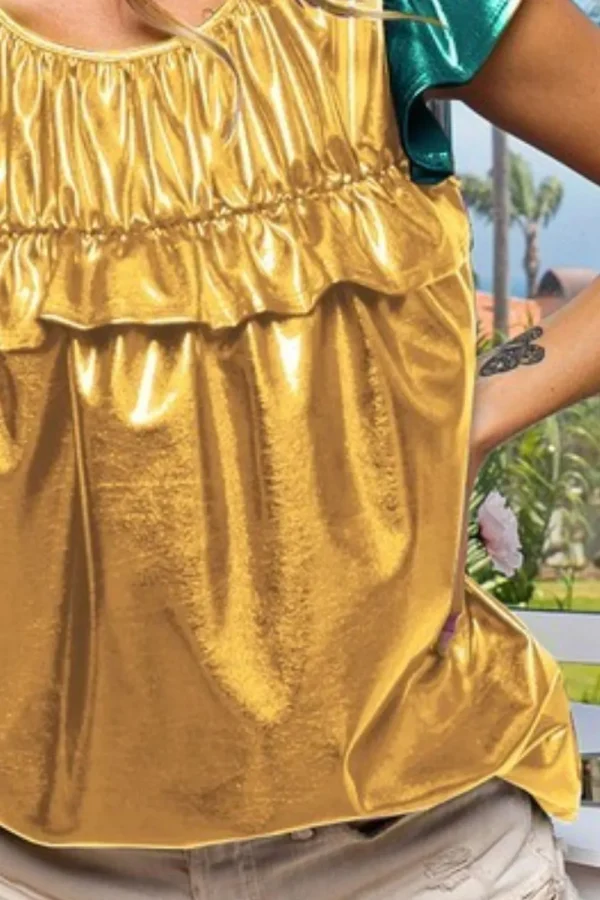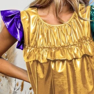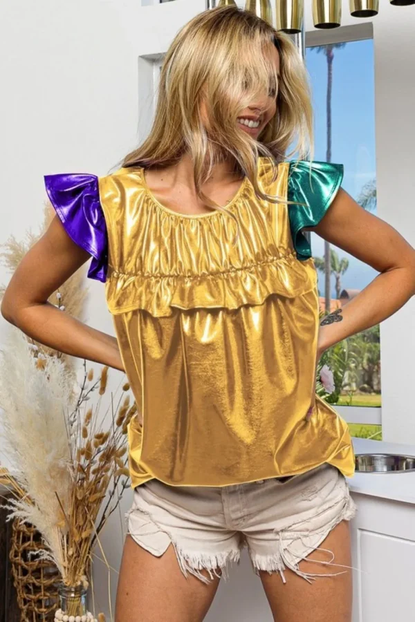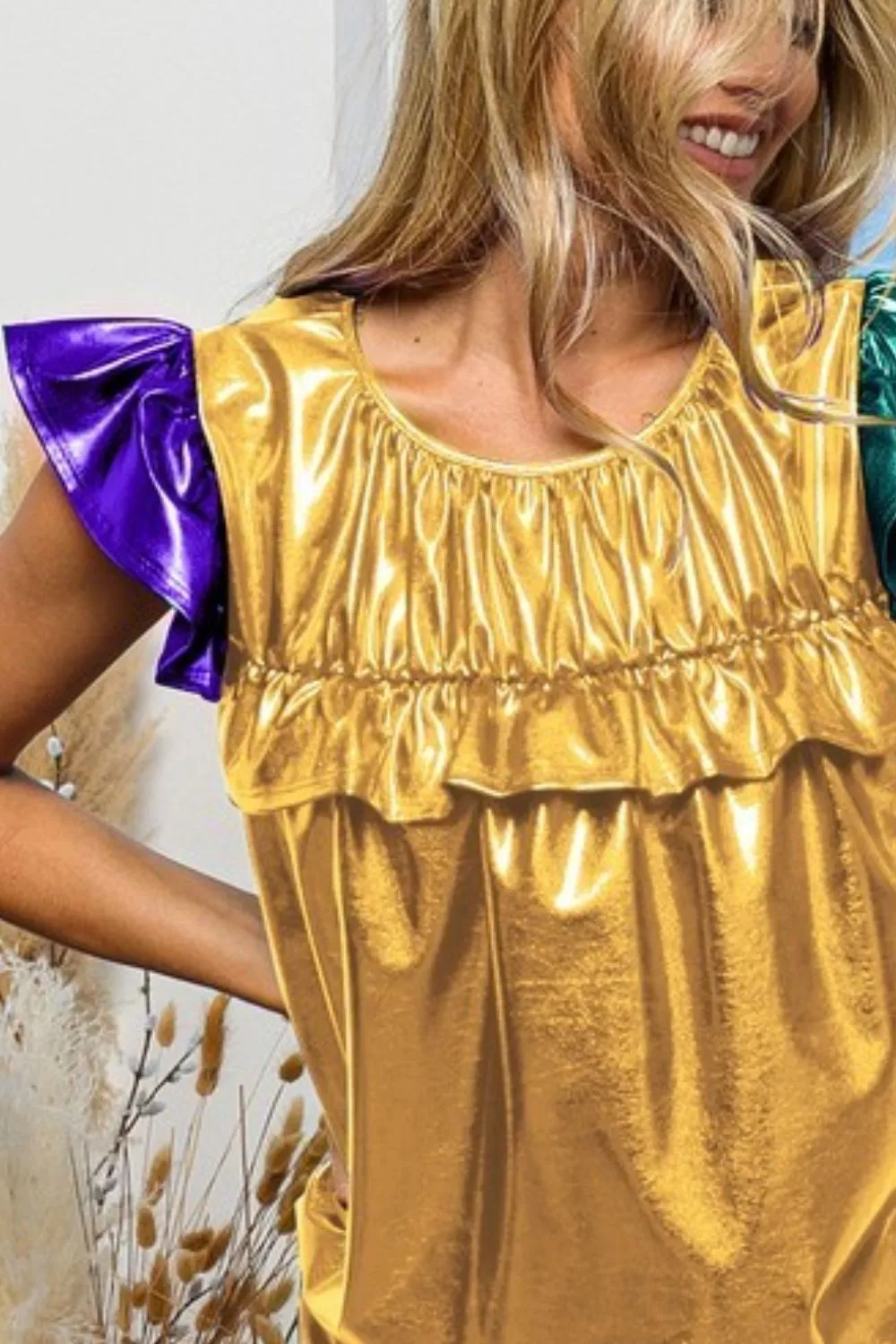 Foiled Knit Color Block Short Sleeve Ruffled Top – Gold/Purple/Hunter