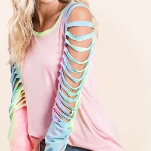 Jersey Knit Top with Tie Dye Laser Cut Sleeves – Blush