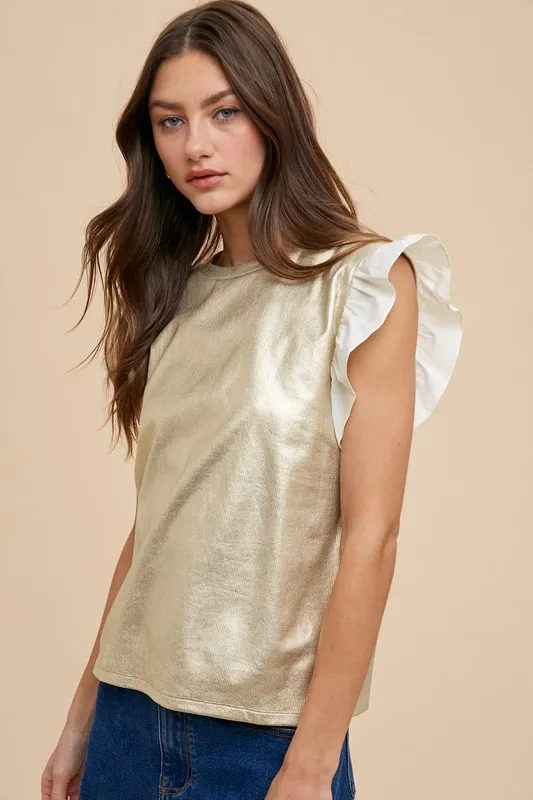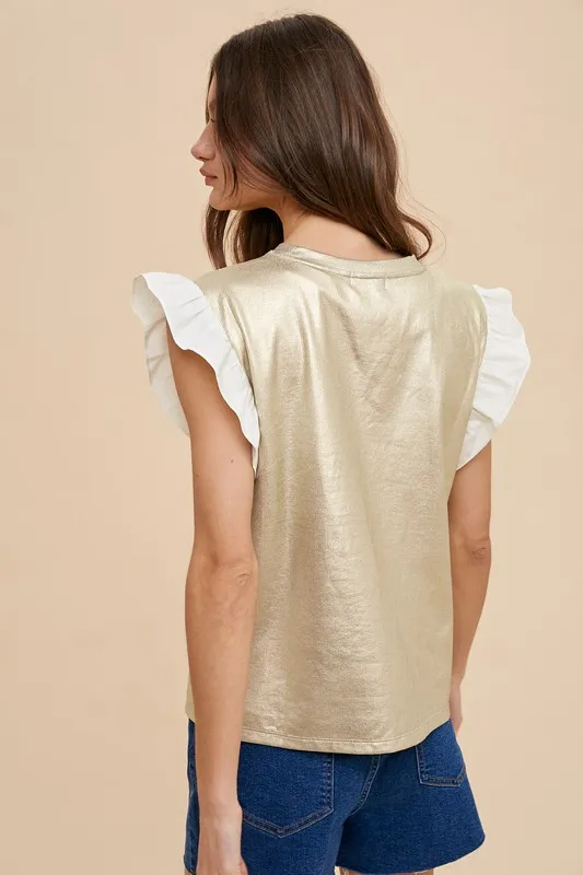 Mix Media Metallic Knit Ruffle Sleeve Top – Ice Gold
