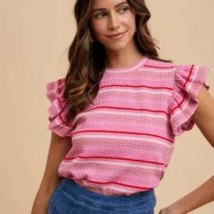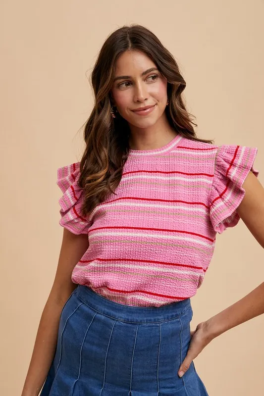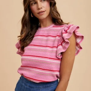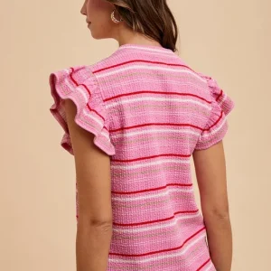 Multi Stripe Ruffle Sleeve Textured Knit Top – Pink