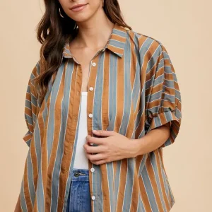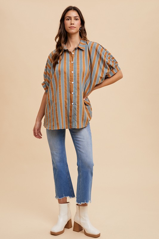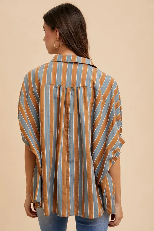 Oversized Drop Shoulder Striped Woven Shirt – Camel Multi
