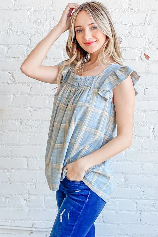 Plaid Print Smocked Detail Ruffle Baby Doll Top – Blue