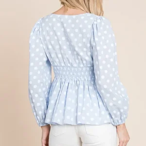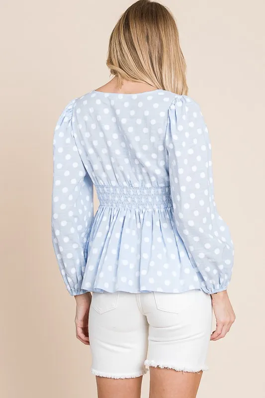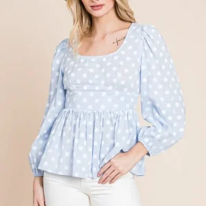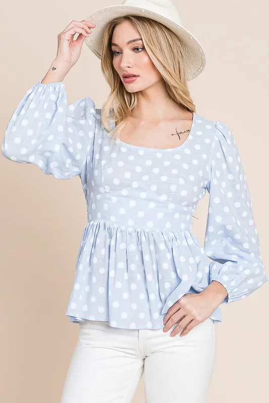 Polka Dot Print Balloon Sleeve Babydoll Peplum Top – Lt Blue