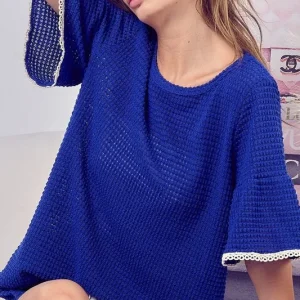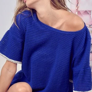 Popcorn Waffle Knit Top with Pompom Lace – Royal