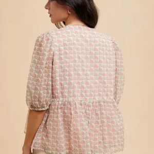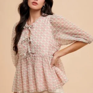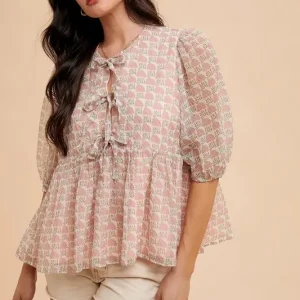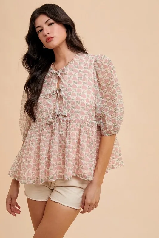 Printed Front Tie Closure Babydoll Blouse – Pink