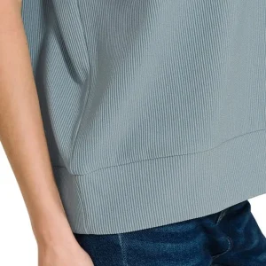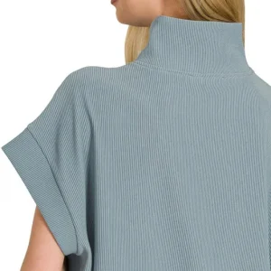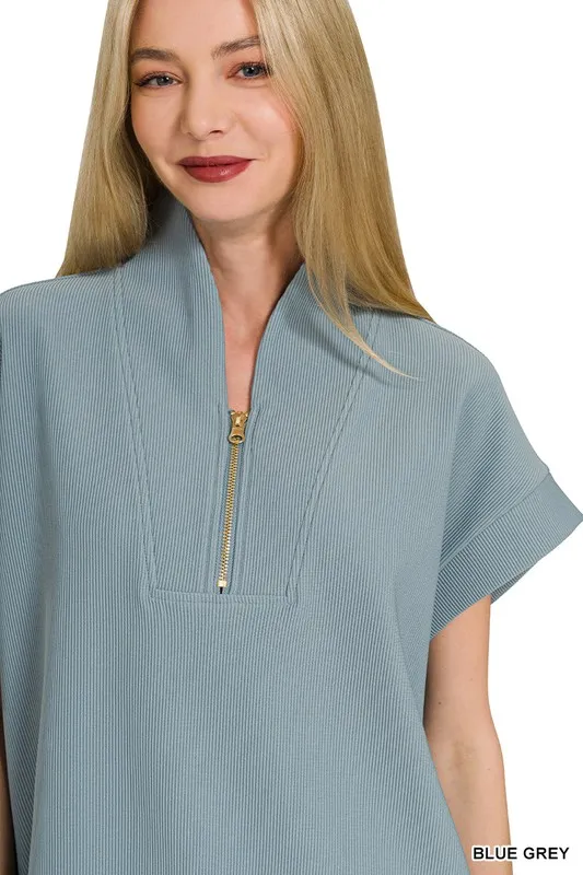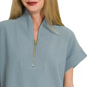 Ribbed High Neck Half Zip Top – Blue Grey