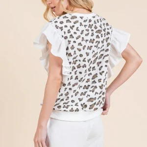 Ribbed Leopard Print Ruffle Detail Sleeveless Top – White Combo