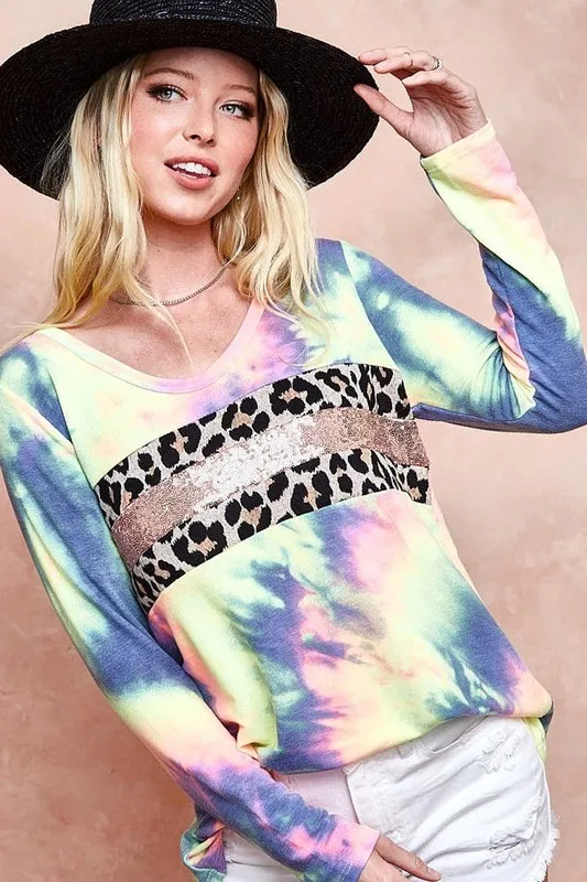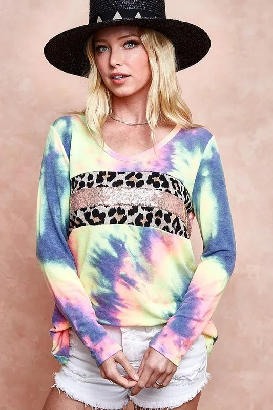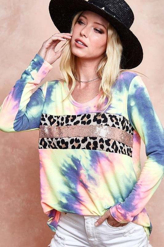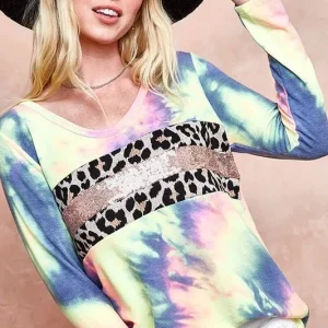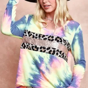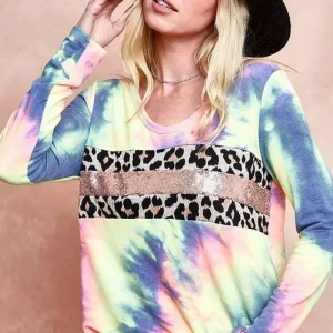 The Tie Dye Deep U-neck Top with Leopard and Sequins is a bold and eye-catching piece that combines multiple trendy elements. The tie-dye pattern gives it a fun and colorful look, while the deep U-neckline adds a touch of allure. The leopard print and sequins detailing provide a stylish and glamorous touch to the top. This top is perfect for making a statement and standing out from the crowd. Pair it with simple bottoms like jeans or shorts to let the top be the focal point of your outfit. The combination of tie-dye, leopard print, and sequins creates a unique and fashion-forward piece that is sure to turn heads.