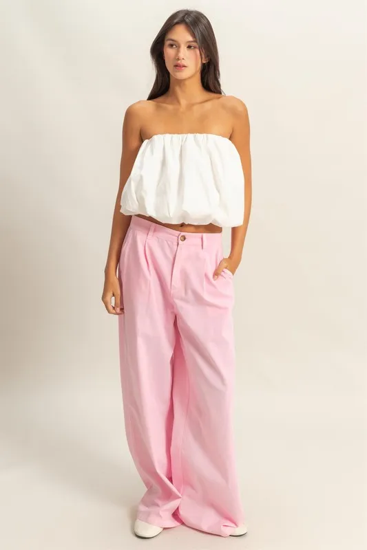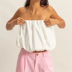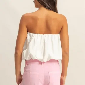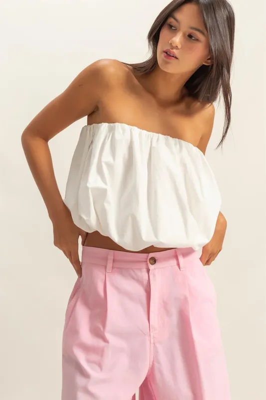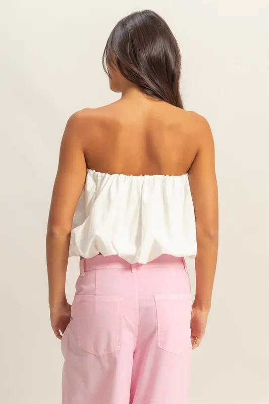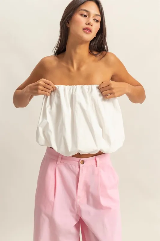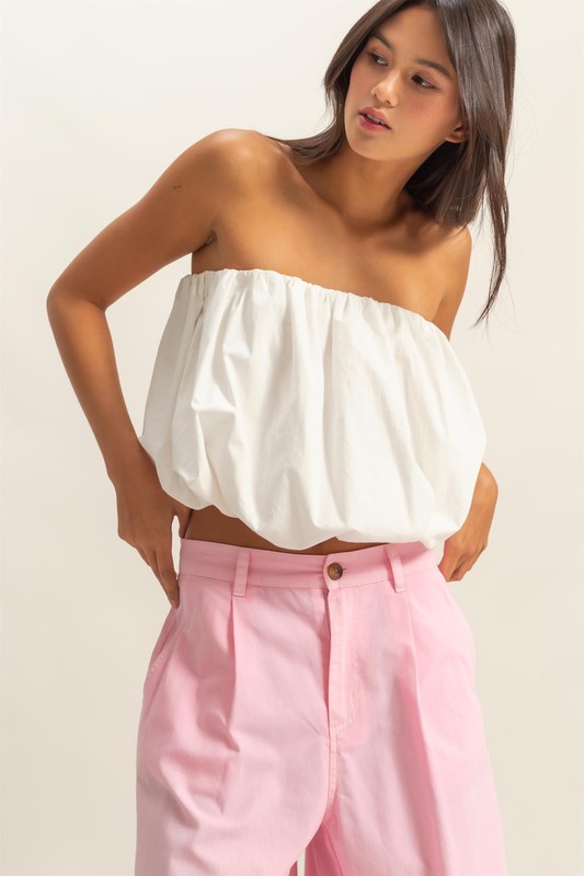 The trendy Strapless Bubble Top is a stylish and chic piece that features a strapless design and a bubble hem for a modern look. This top adds a touch of elegance and sophistication to any outfit, making it a versatile choice for various occasions.