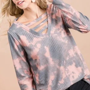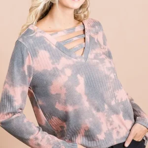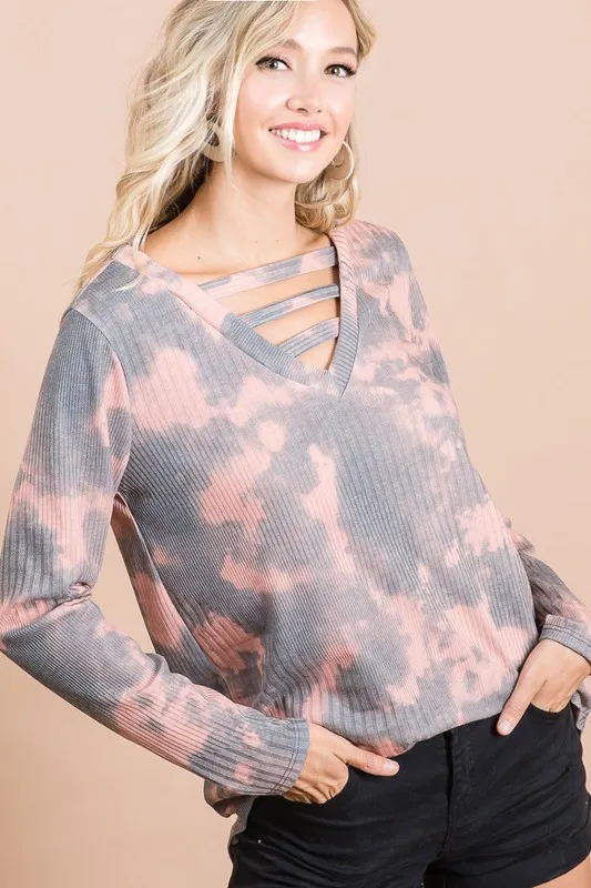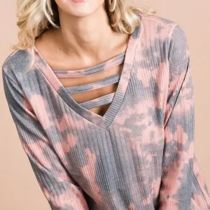 Variegated Tie Dye Rib V-Neck Top with Strapped – Rust Multi