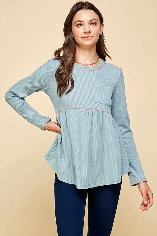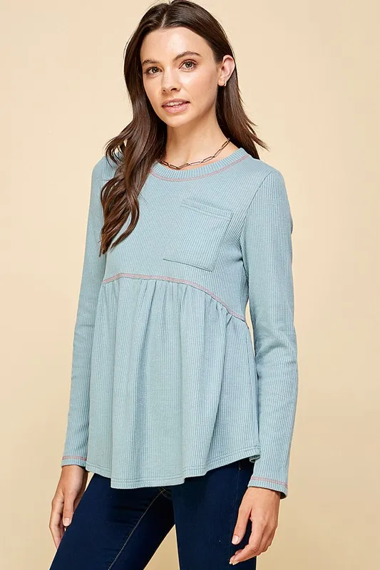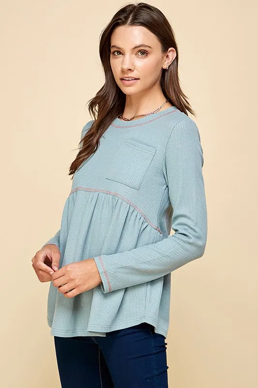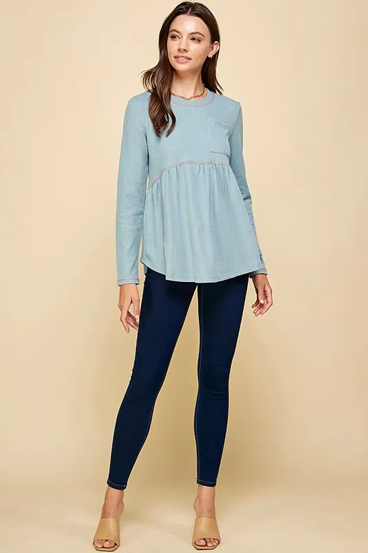 Waffle Knit Babydoll Top with Left Pocket Detail – Sea Blue