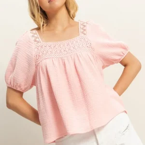 Crochet Detail Puff Sleeve Peasant Top – Baby Pink