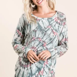 Tie Dye Print Terry Top with Front Patch Pocket – Blue/Blush