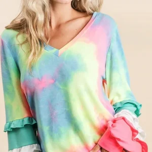 Tie Dye V Neck Top with Color Block Sleeves – Pastel Tie Dye
