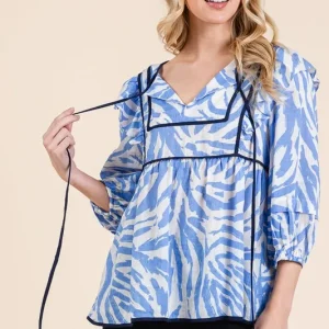 Graphic Print Solid Trim Quarter Sleeve Blouse – Blue
